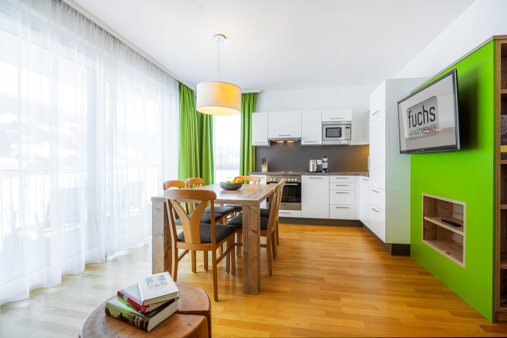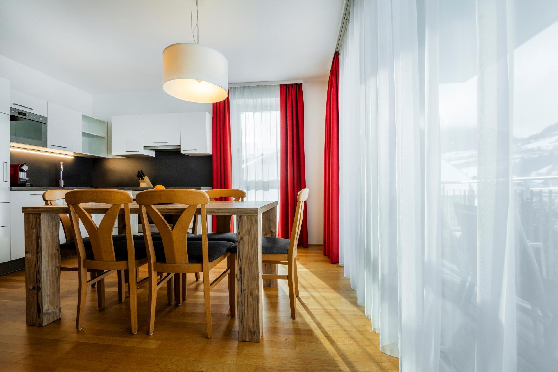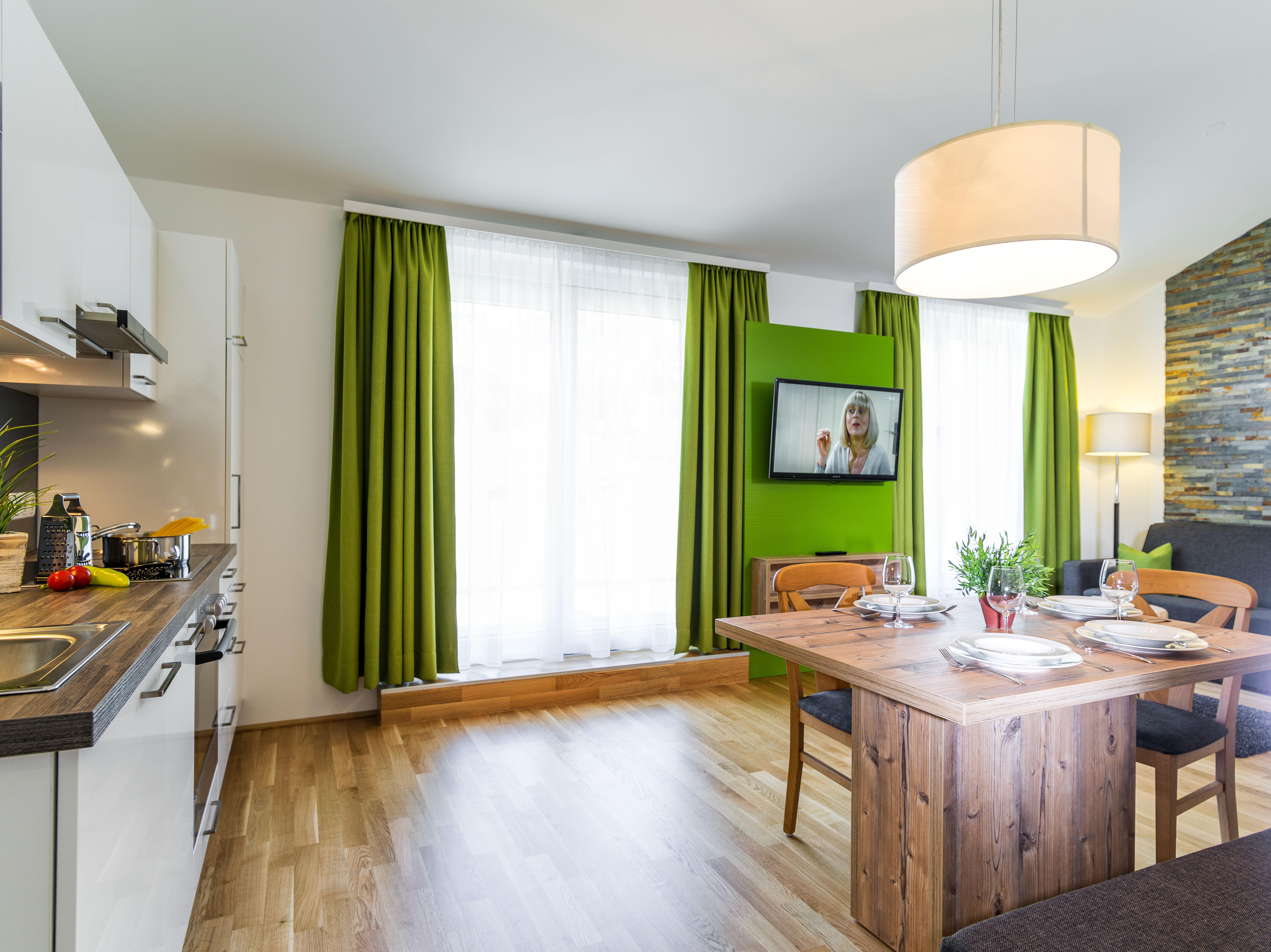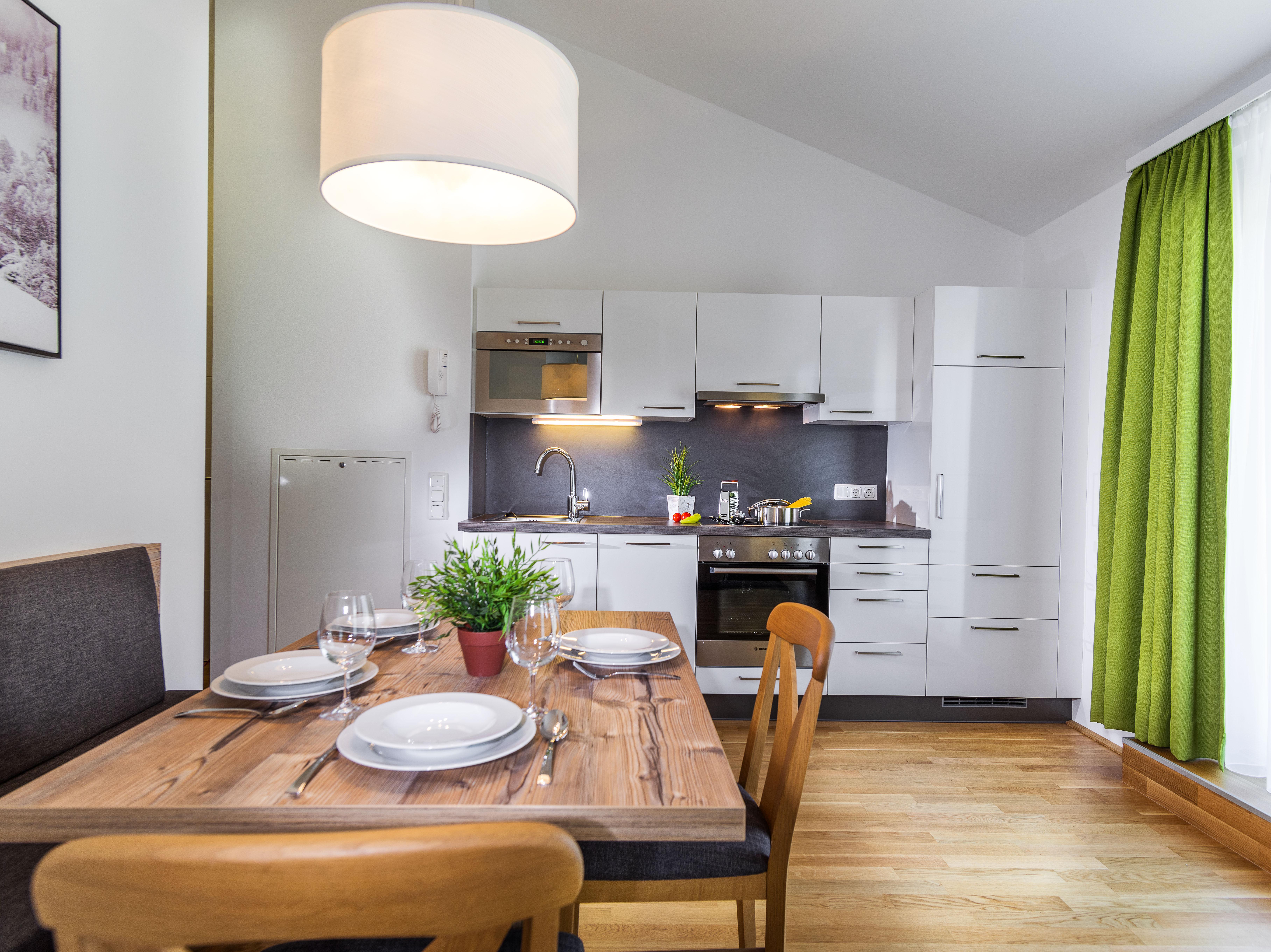 Wo alpiner Lifestyle gelebt wird – erst 2012 eröffnet, bestechen unsere fünf, rauchfreien Apartments durch ihre zeitgenössische und stilvolle Einrichtung. Hochwertige Vollholzmöbel und warme Farben verleihen den 50-69m² großen und für 2-6 Personen ausgelegten Wohnungen Charme und einen eigenen Charakter. Im ersten Stock oder im Dachgeschoss gelegen, genießen Sie hier schon beim Aufstehen einen unvergesslichen Blick auf die Gasteiner Berge. Alle unsere Wohnungen halten eine voll ausgestattete Küche bereit, sodass Sie aktive Ski- und Wandertage mit einem selbst zubereiteten Abendessen ausklingen lassen können.