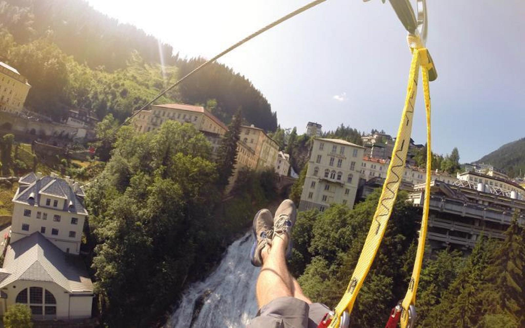 Flying Waters - that is a ride on pulleys on a wire rope - hanging over the canyon of the Gasteiner Ache. What sounds so dangerous, however, becomes risk-free adventure fun for the whole family thanks to the perfect securing by professionals. The 300-meter-long route leads from Villa Solitude to the thermal spring park, where not only the view of the thunderous waterfall, the landmark of Bad Gastein, is impressive. A great view over the historic town center, the waterfall path and Grabenbäckersteig including yoga platform, as well as the fascinating mountain world of the Hohe Tauern in the Salzburger Land is guaranteed.