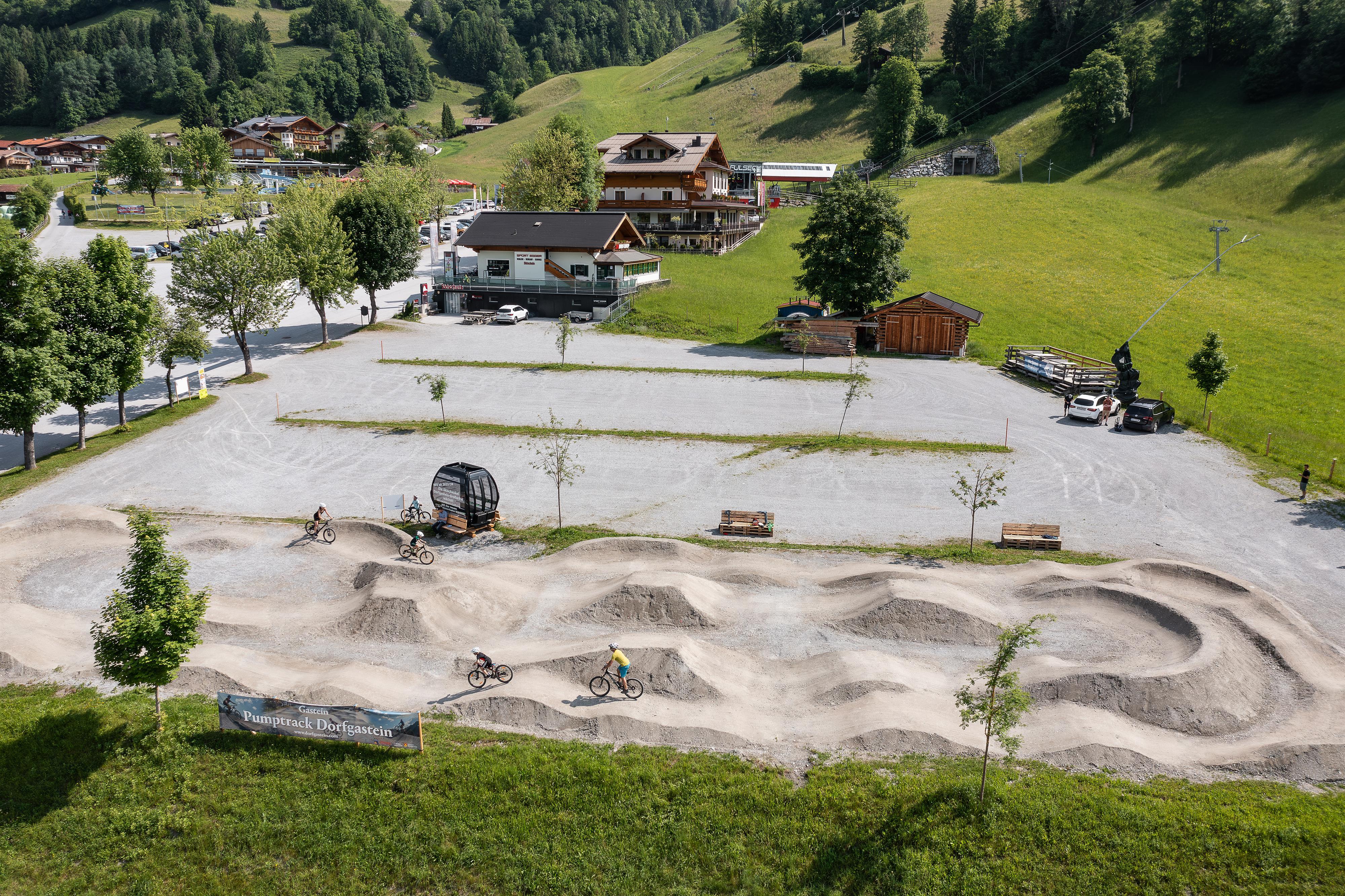 Der Pumptrack in Dorfgastein besteht aus Wellenbahnen, die zu einem Rundkurs verbunden sind, dass ein Fahrerlebnis mit Flow entsteht. Dabei treten die Fahrer nicht in die Pedale, sondern bewegen ihr Bike durch Drücken und Ziehen in den Steilkurven und Wellen. Wer das Rad gut beherrscht, kann auch über die Hügel springen oder Tricks in der Luft zelebrieren. Vom Kleinkind mit dem Tretrad bis zum Fortgeschrittenen findet sich für alle ein entsprechendes Angebot.