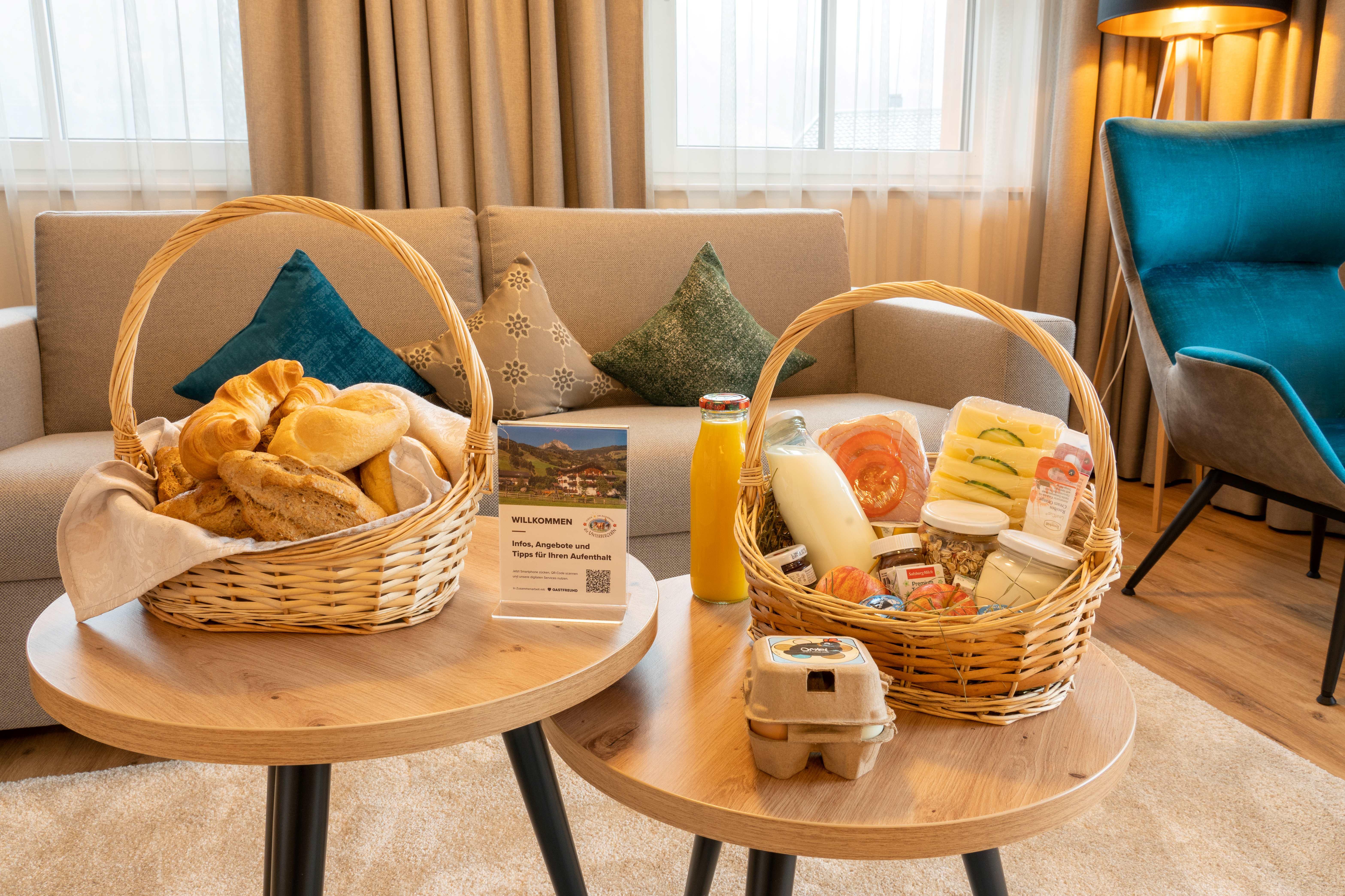 Start your day with a delicious gourmet breakfast buffet and treat yourself to regional delicacies. From home-pressed apple and carrot juice, organic eggs from our own farm, freshly flaked oats for muesli to prosecco and kombucha, you will find everything your heart desires here. A delicious thermal breakfast is also offered for early risers (please register). Guests of the holiday apartments have the option of booking the breakfast guesthouse's buffet, breakfast baskets and bread roll service optionally and also on a daily basis. The in-house farm shop also has numerous homemade products and dishes that you can heat up yourself in your holiday apartment. There is also a vending machine with a selection of drinks and snacks for when you are a little hungry or very thirsty. Enjoy the end of your holiday on your own balcony or in the traditional farmhouse parlor with a cozy glass of wine.