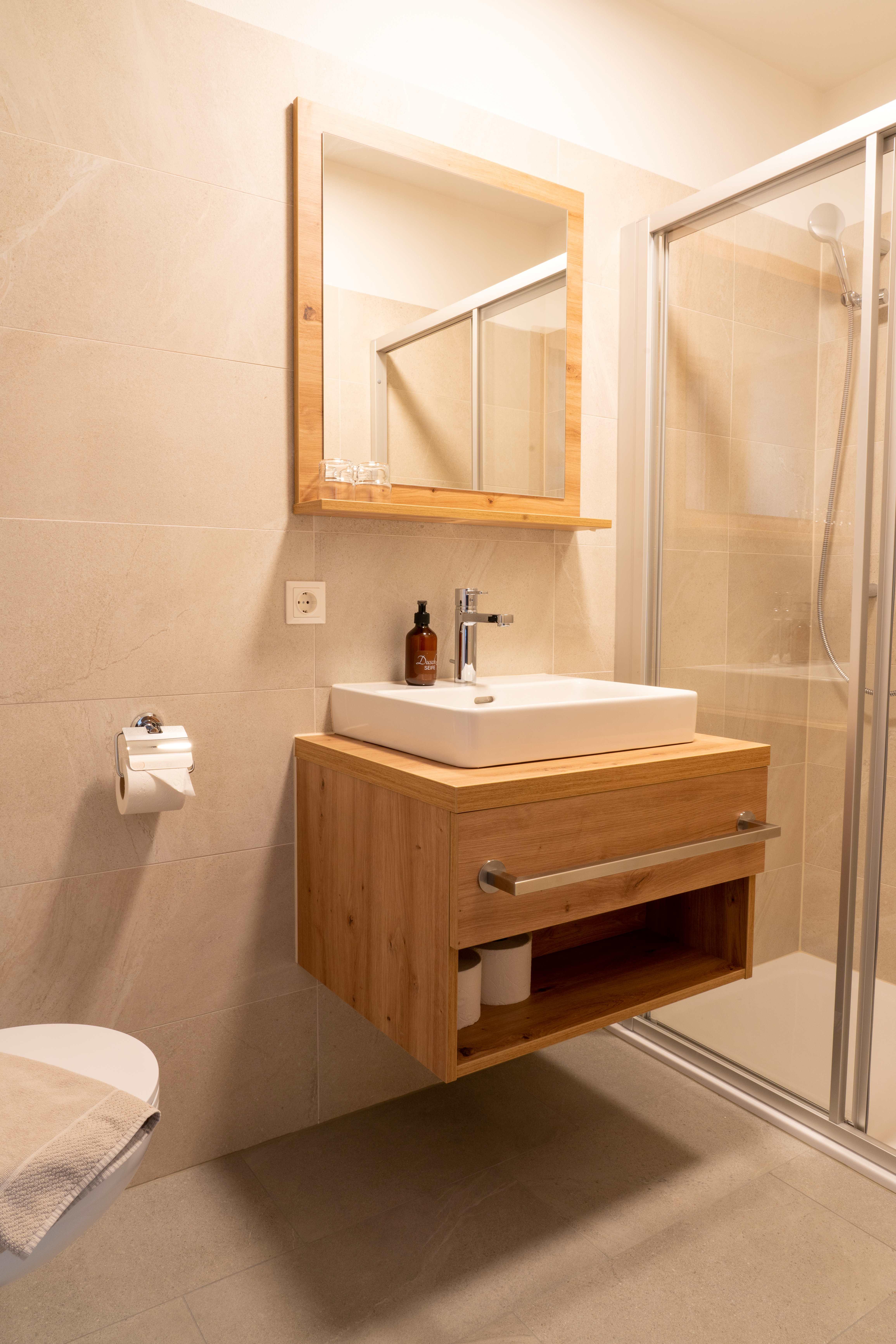 - spacious, solid wood furnished single-, double-, family-rooms and studios with box spring beds in top quality “Treca”, shower or bathtub, separate toilet