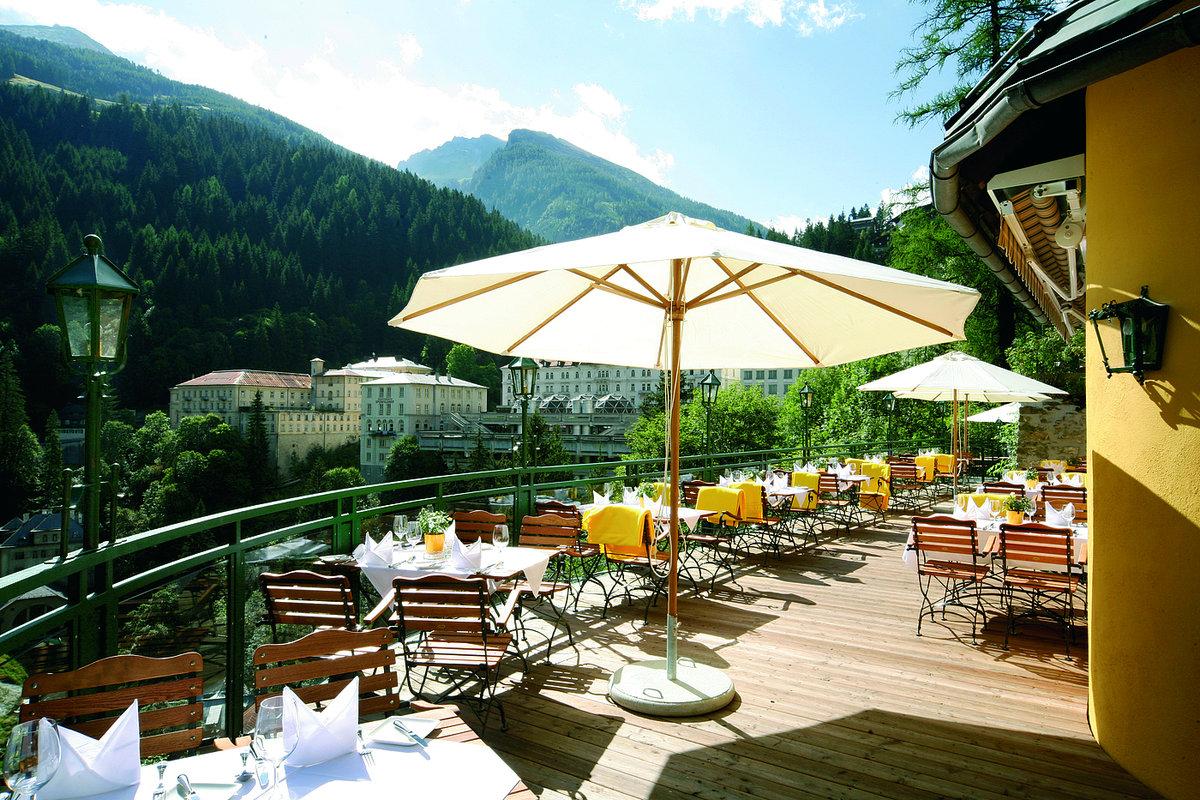 Im Sommer bietet die Hotelterrasse einen einzigartigen Blick auf die pittoreske Altstadt, den berühmten Gasteiner Wasserfall und die
