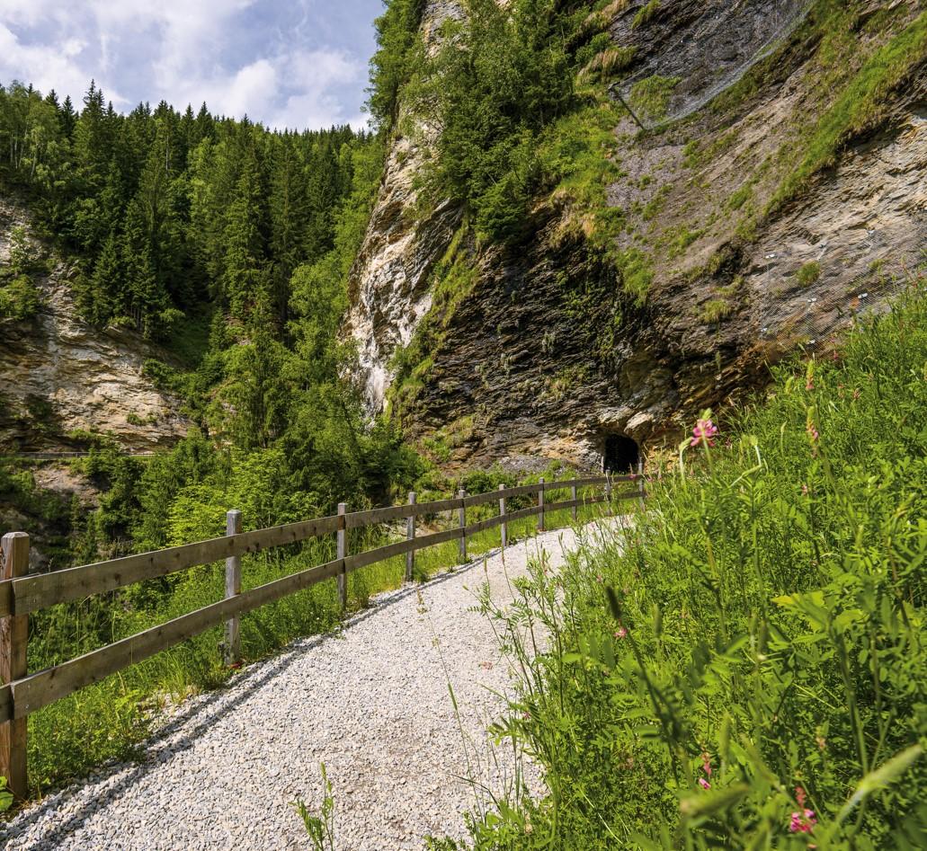 The Gasteiner Höhenweg was built in 1934 and leads from Bad Hofgastein to Bad Gastein at a constant altitude of 1,000 metres. The bridge that led guests across the Gadauner Gorge was destroyed several times during storms, so around two decades later an almost 50 metre long tunnel was cut out of the rock at this point. The so-called ‘Katharinastollen’ enables guests to cross the gorge safely, with spectacular and exciting views in front of and behind the waterfall.