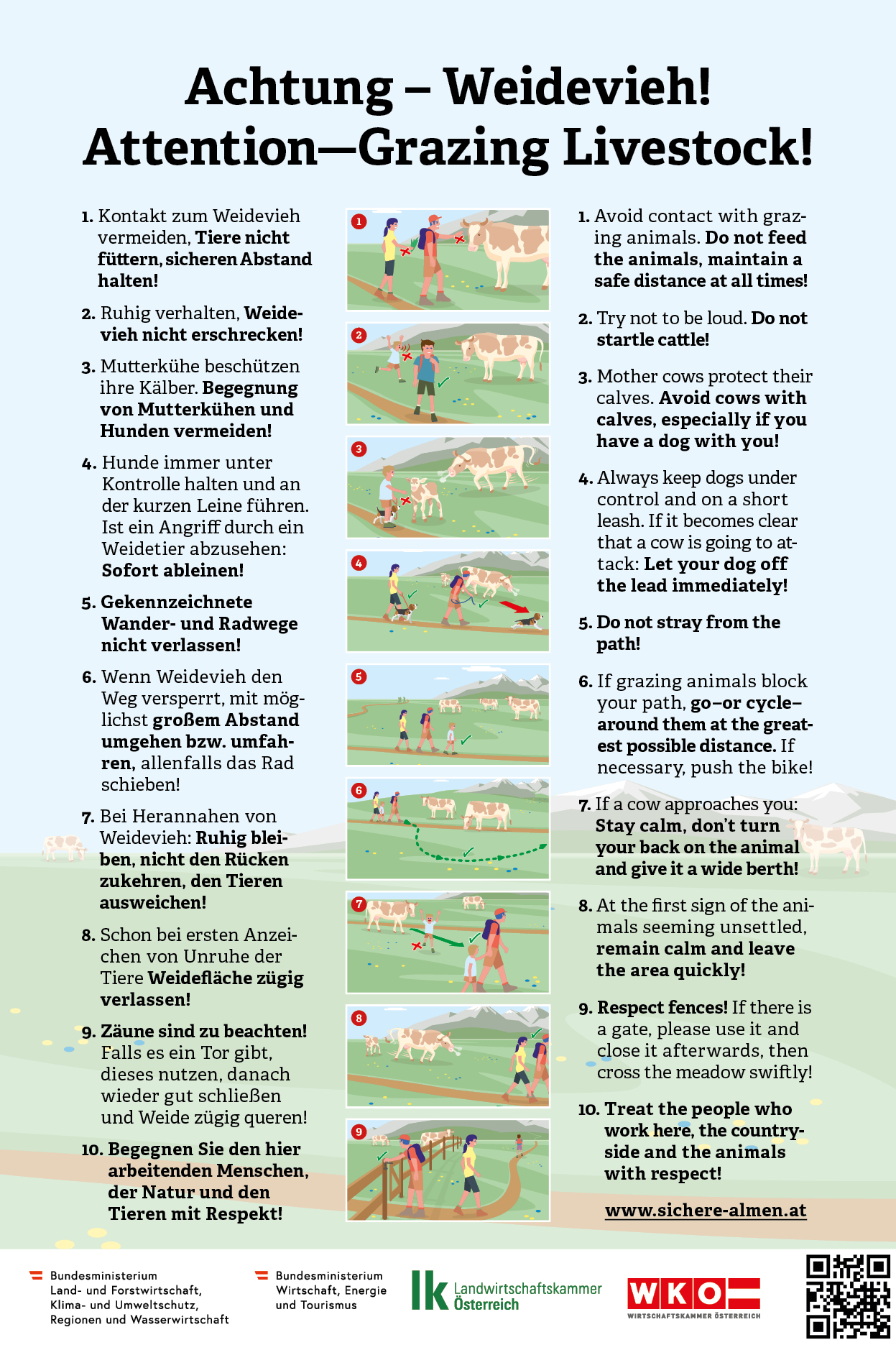 Bei Mutterkühen mit Kälbern ist besondere Vorsicht geboten! Die Mutter will ihr Junges beschützen und reagiert auf etwaiges Streicheln oder Nähern besonders sensibel. Abstand halten ist besonders wichtig. Am besten geht man langsam und ruhig an dem Tier vorbei. Um sich optisch einen nötigen Respekt zu verschaffen, kann man einen Stock mit sich führen. Hunde muss man immer an der Leine führen. Rinder und Pferde nehmen Hunde als besondere Gefahr wahr. Tiere nicht füttern!