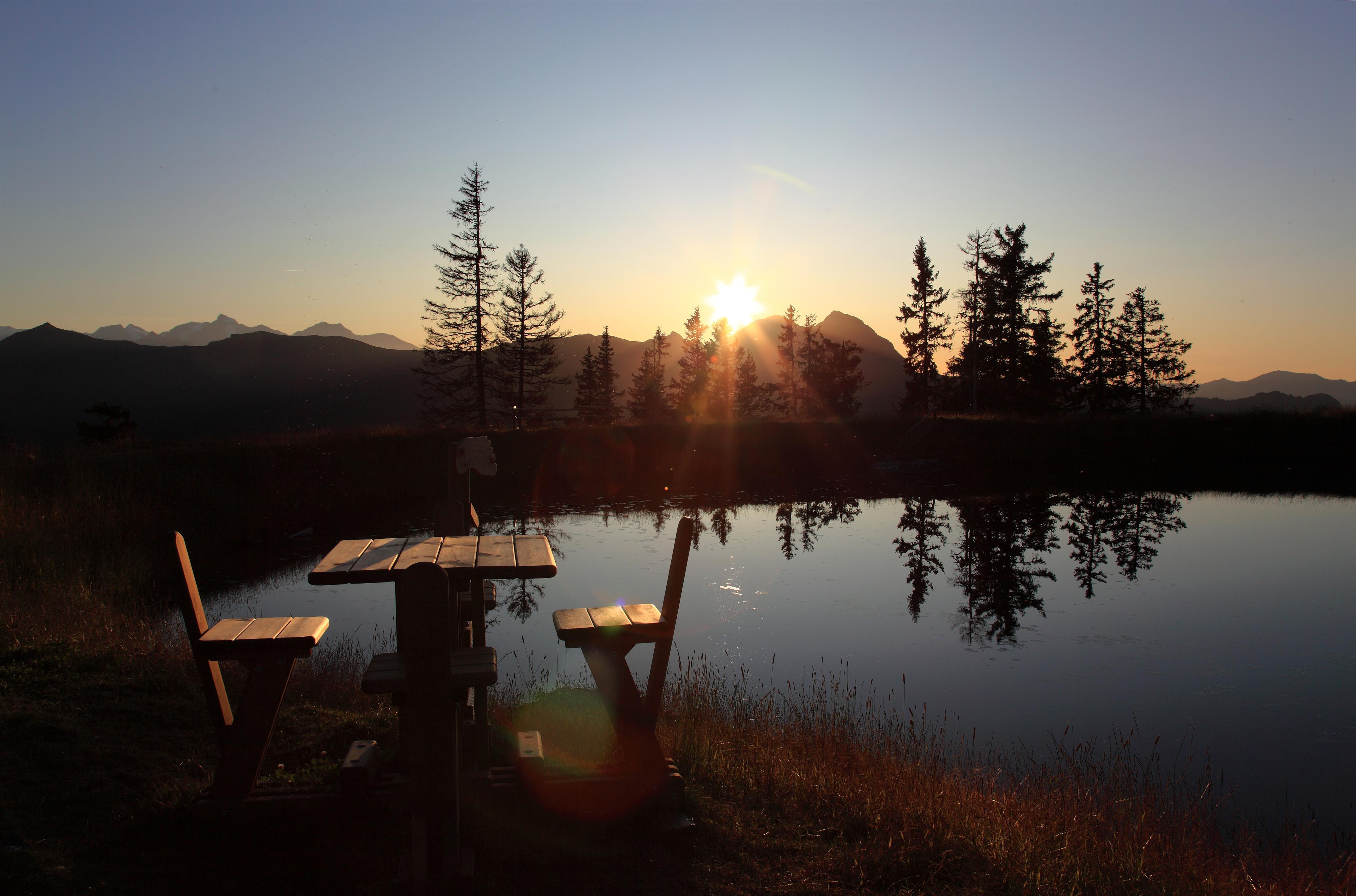 Wenn an klaren Sommerabenden hier auf 2.000 Metern Seehöhe die letzten Sonnenstrahlen das Gipfelplateau erreichen, dann taucht die gesamte umliegende Bergwelt in ein unbeschreibliches Farbenspiel. Dieser Balanceakt zwischen Tag und Nacht schafft eine magische und friedliche Atmosphäre.