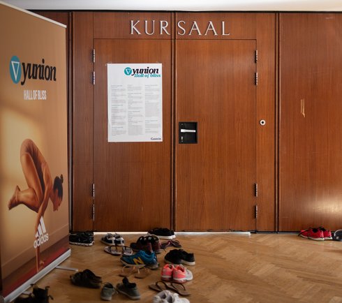 Der große Seminarraum im Kongresszentrum Bad Hofgastein ist der vielseitigste Raum des yunion Yoga Festivals. Hier finden Massage-Workshops, Business-Coaching und Yin-Yogastunden statt. Die Akustik in diesem Raum ist ausgezeichnet, und die deckenhohen Fenster spenden den Workshops viel Helligkeit.