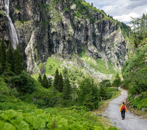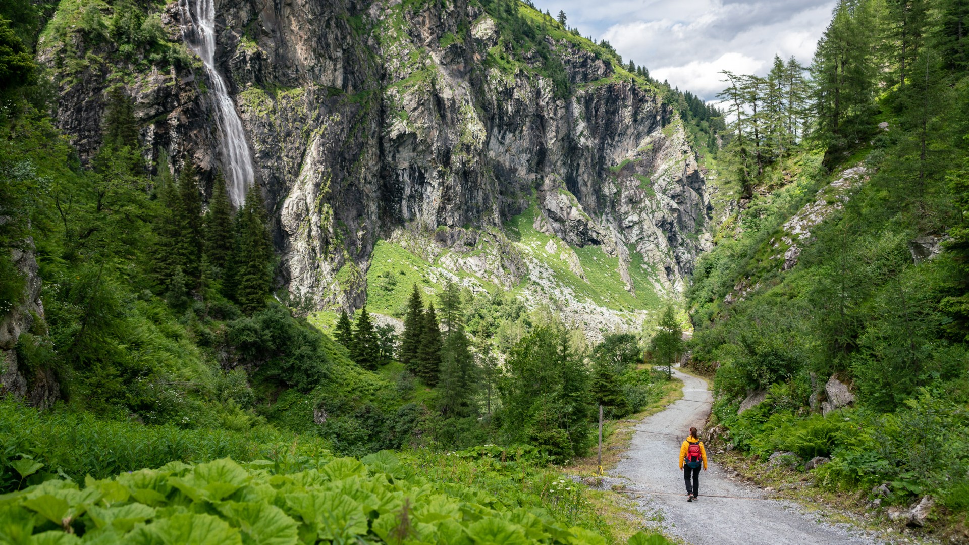 Ein Blick auf den Talboden Sportgasteins und die Hohe Tauern - die Wanderung startet. Entlang des Zwei-Farben-Flusses führt der Weg vorbei an Speicherkavernen bis zum Kraftwerk Nassfeld. Von dort aus leitet eine alte Trasse – der alte Nassfelderweg, einst wichtig für Handel und Bergbau, in Richtung Böckstein. Der Weg ist gesäumt von vielen Naturattraktionen – der Bärenfall, Schleierfall und Kesselfall tosen mächtig von den Bergen herab. Nicht nur die Geschichte des Bergbaues wird entlang des Weges deutlich, sondern auch Relikte aus dem Ersten Weltkrieg – die „Russen Brücke“ wurde zu Zeiten des Ersten Weltkrieges von russischen Kriegsgefangenen gebaut. Die beiden Astenalmen (bewirtschaftet) gehören zu den ältesten des Gasteinertales und laden zum Einkehren ein. Der Themenweg des Gasteiner Heilstollens führt vorbei an einer einstigen Schmelzhütte und dem Pulverturm von Altböckstein nach Böckstein. Die wunderschöne Wallfahrtskirche „Maria vom Guten Rat“, die auf einer Anhöhe gelegen ist, bietet einen optimalen Blick auf die geplante Stadt Böckstein.