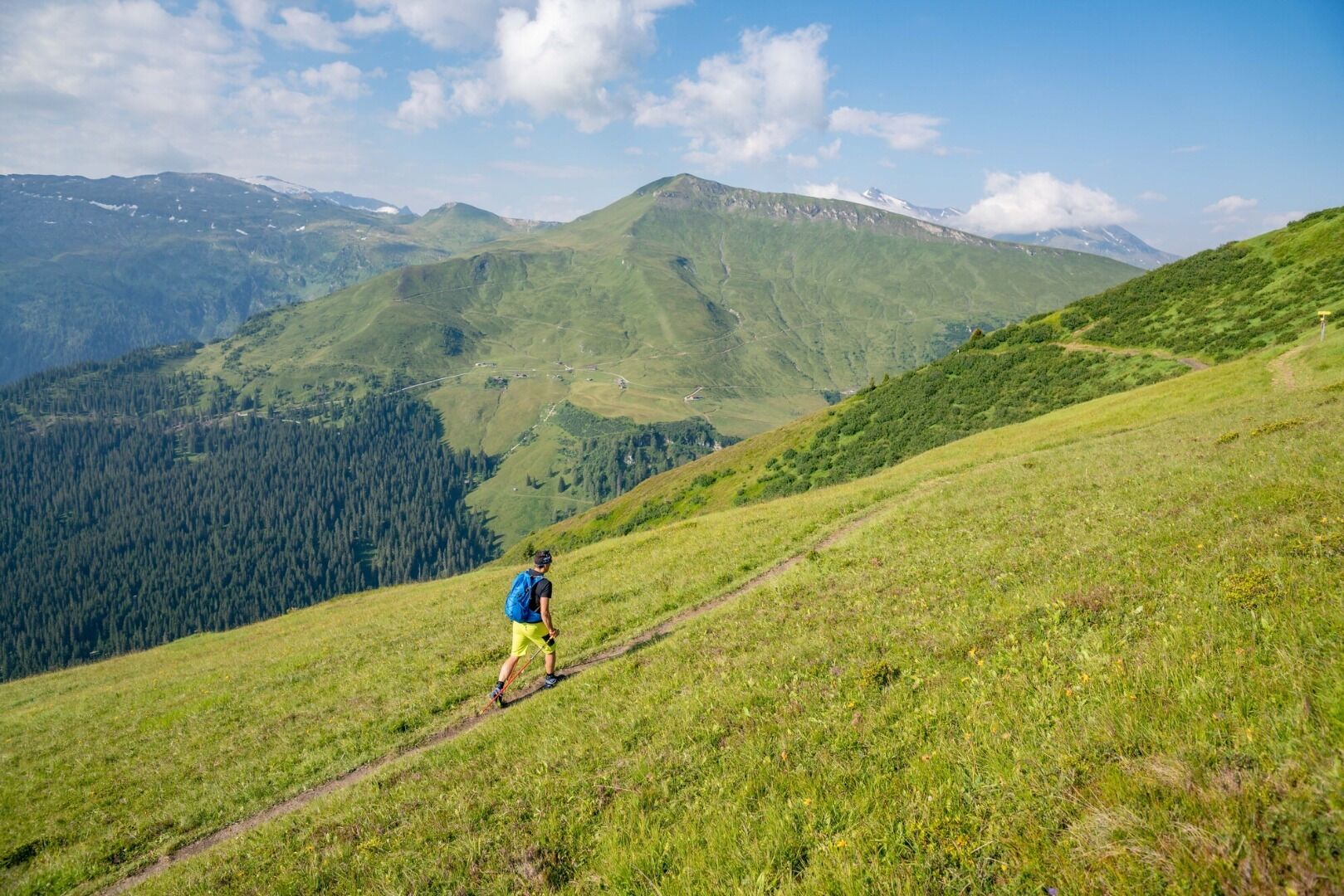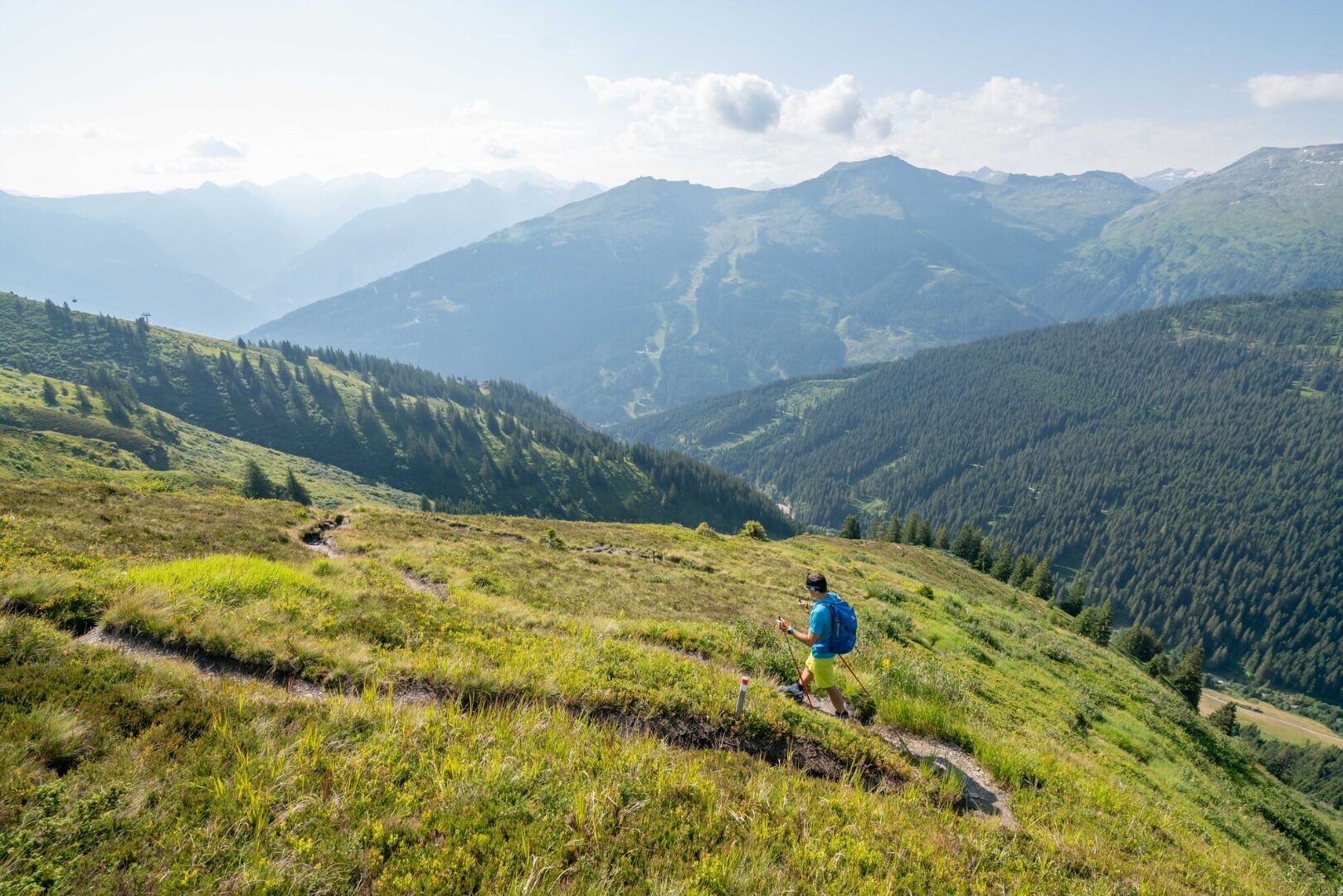 Beginn der Wanderung ist die Bergstation der Schlossalmbahn. Die Route führt über einen alten Verbindungsweg, den „Hermann-Kreilinger-Steig“ in Richtung Rockfeldalm (bewirtschaftet). Trittsicherheit und Schwindelfreiheit sind auf diesem Wegabschnitt unbedingt notwendig. Der Blick auf die Gadaunerer Hochalmen gegenüber lässt erahnen, dass viele dieser Almhütten im Sommer bewirtschaftet sind. Speck, Butter, Käse – da läuft das Wasser im Mund zusammen. Das treibt an. Auffallend sind die hochgelegenen Mähder, die jeden Sommer gemäht werden. Bäuerliche Kultur auf solch einer Seehöhe – beeindruckend. Viele Heustadeln säumen den Weg und der Duft von frischem Heu liegt in der Luft. Mit dem Sommerwind im Rücken geht es über saftige Almwiesen zu den Gadaunerer Hochalmen. Von hier aus ist der Hermann-Kreilinger-Steig gut zu sehen – die steilen Grashänge beeindrucken. Ebenso der Blick auf die Türchlwand und die Sieben Spitz ist imposant. Der Abstieg erfolgt über einen Pfad durch dichten Fichtenwald ins Angertal.