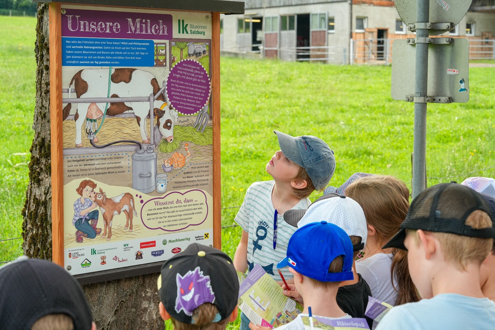 Doch wie gut weißt du über den Alltag am Bauernhof Bescheid? Wie viel Gras frisst eine Kuh, wie oft werden Kühe gemolken, wie oft legt das Huhn ein Ei? Diese und noch viele interessante Fragen und die passenden Antworten findet man auf 13 liebevoll illustriert und anschaulich dargestellten Tafeln entlang des Themenweges.