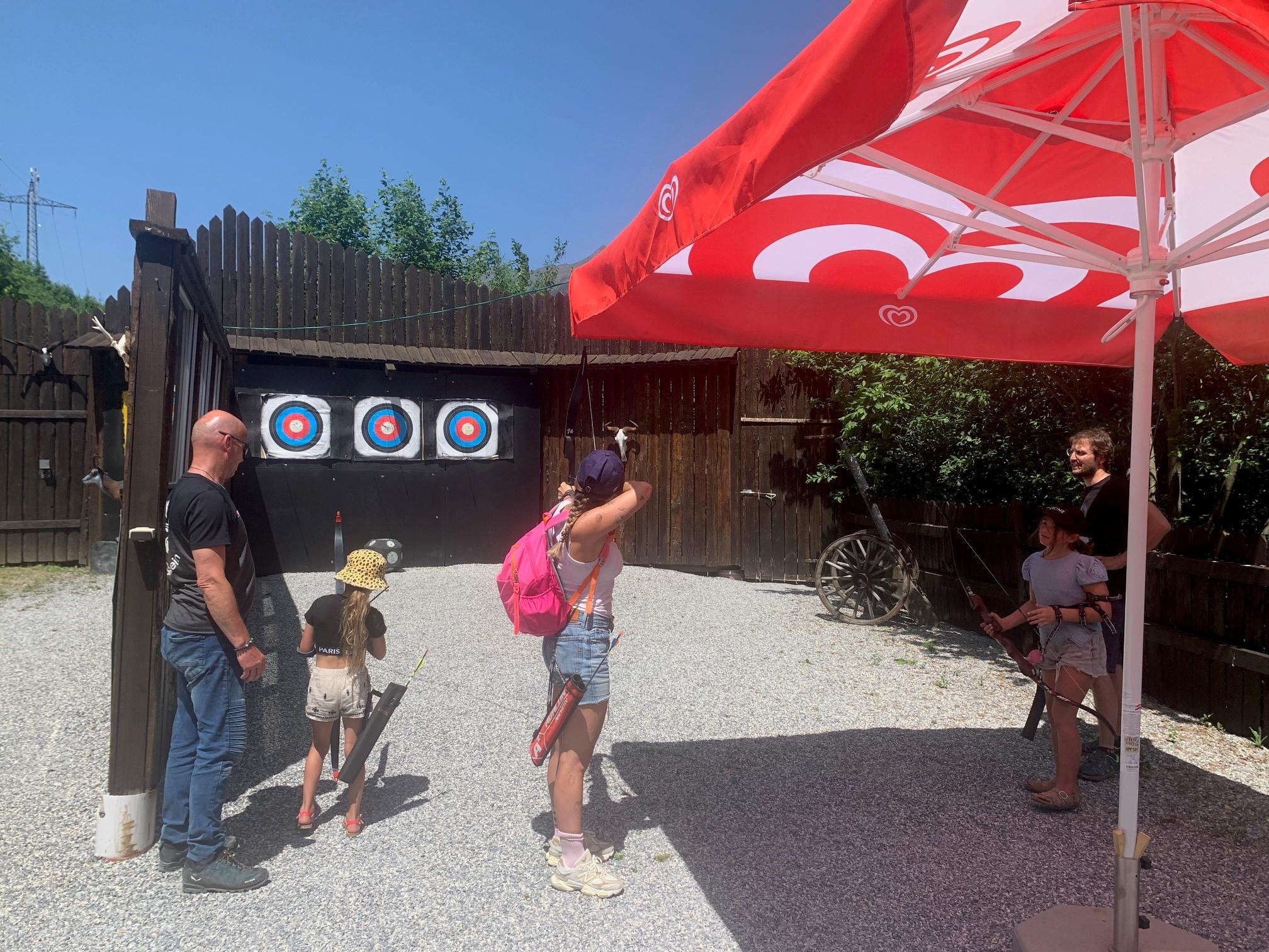 Practice your concentration and accuracy. Get the appropriate equipment (arrows & bow, arm protection, finger protection, arrow boxes) directly at the issuing station.
