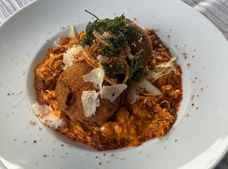 Frittierte Gulasch- Arancini mit Szegedinerkraut