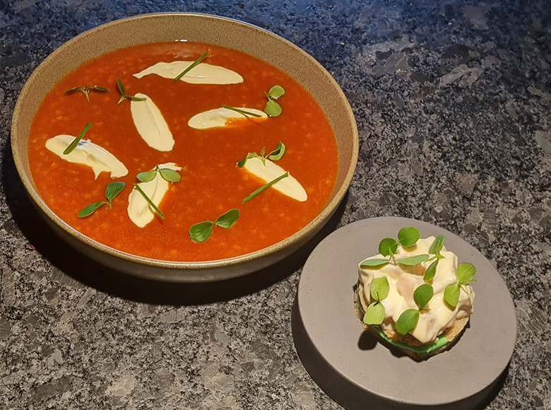 Gebundene Fischsuppe aus regionalen Fischen mit Schnittlauch Toast und Räucherfischsalat