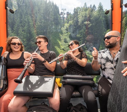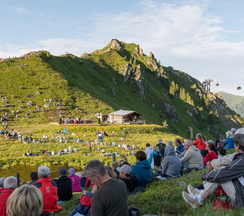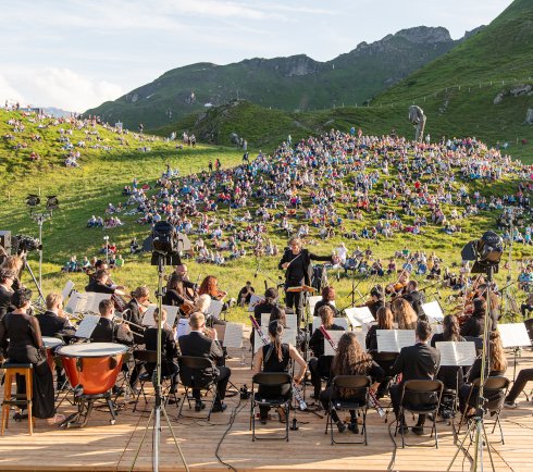 Op het bergstation van de kabelbaan Schlossalm en omringd door imposante bergtoppen als de Mauskarspitze en de Hirschkarspitze genieten de concertgasten van een dromerige muziekavond.