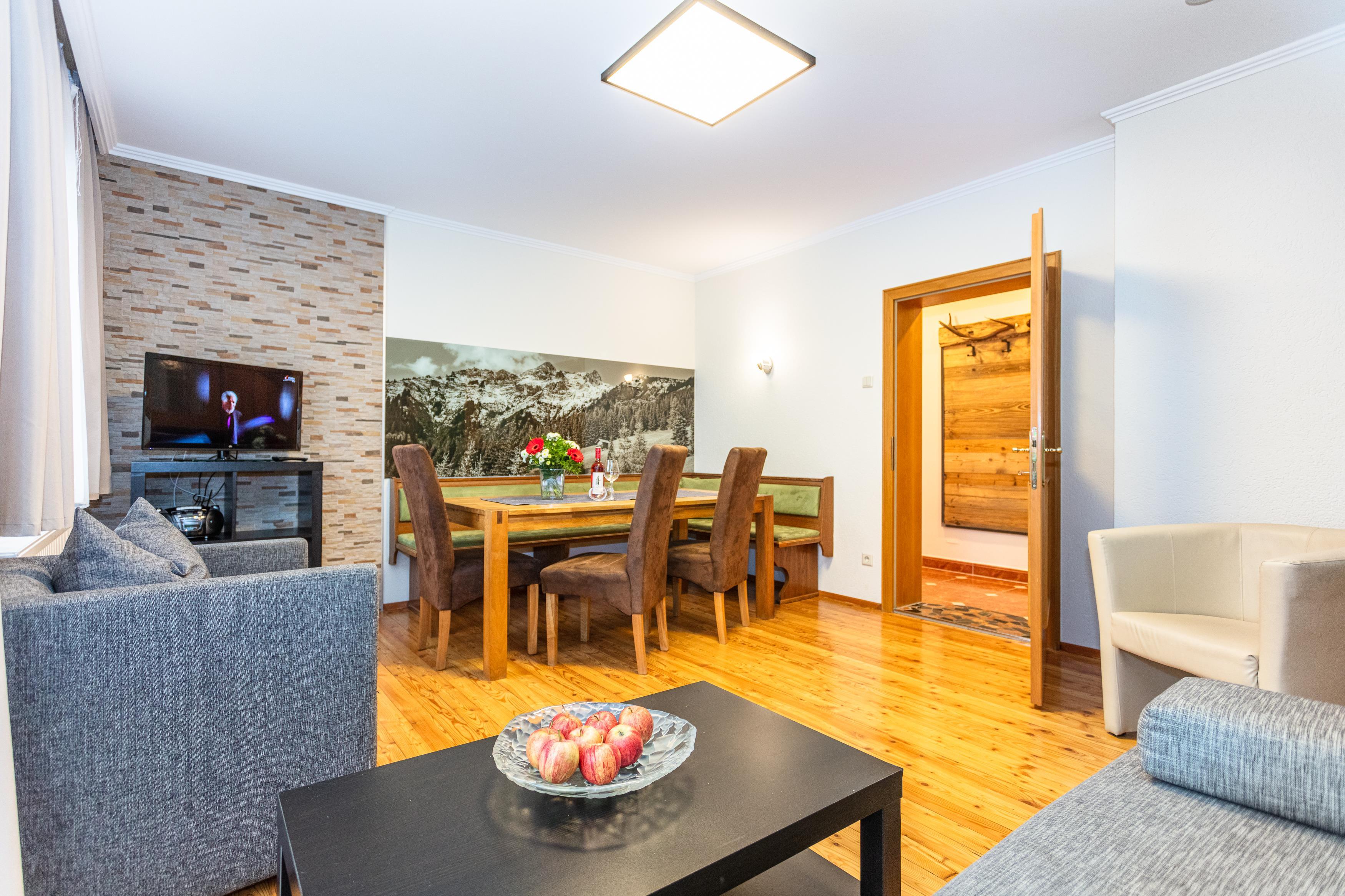 Our Ferienhaus Antonia, built in alpine style, impresses with comfort and coziness. In our three 85m² apartments and two 55m² apartments, you will find ample space for the whole family during your winter holiday or summer vacation. In apartments types 1 and 2, you will find a fully equipped kitchen or a small living kitchen, a pull-out sofa bed, a bathroom with a separate WC, and cable TV. Enjoy a wonderful mountain panorama from the balconies of the apartments. Let your cozy holiday days end in the garden while grilling with the family.