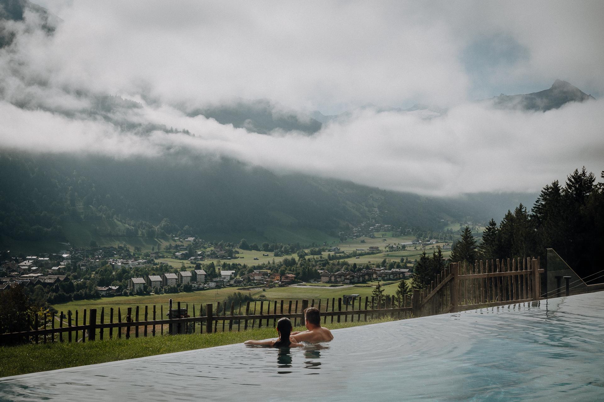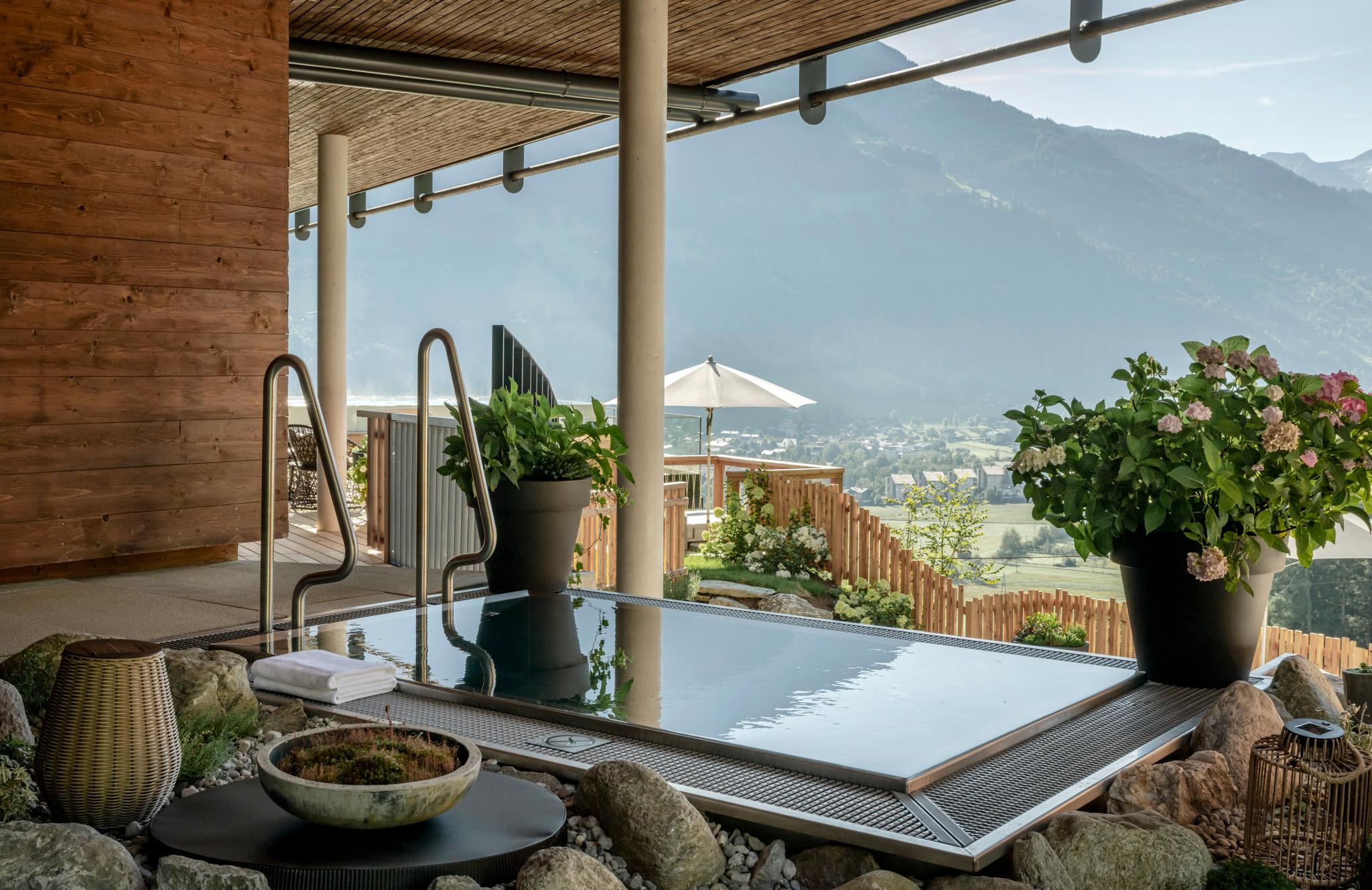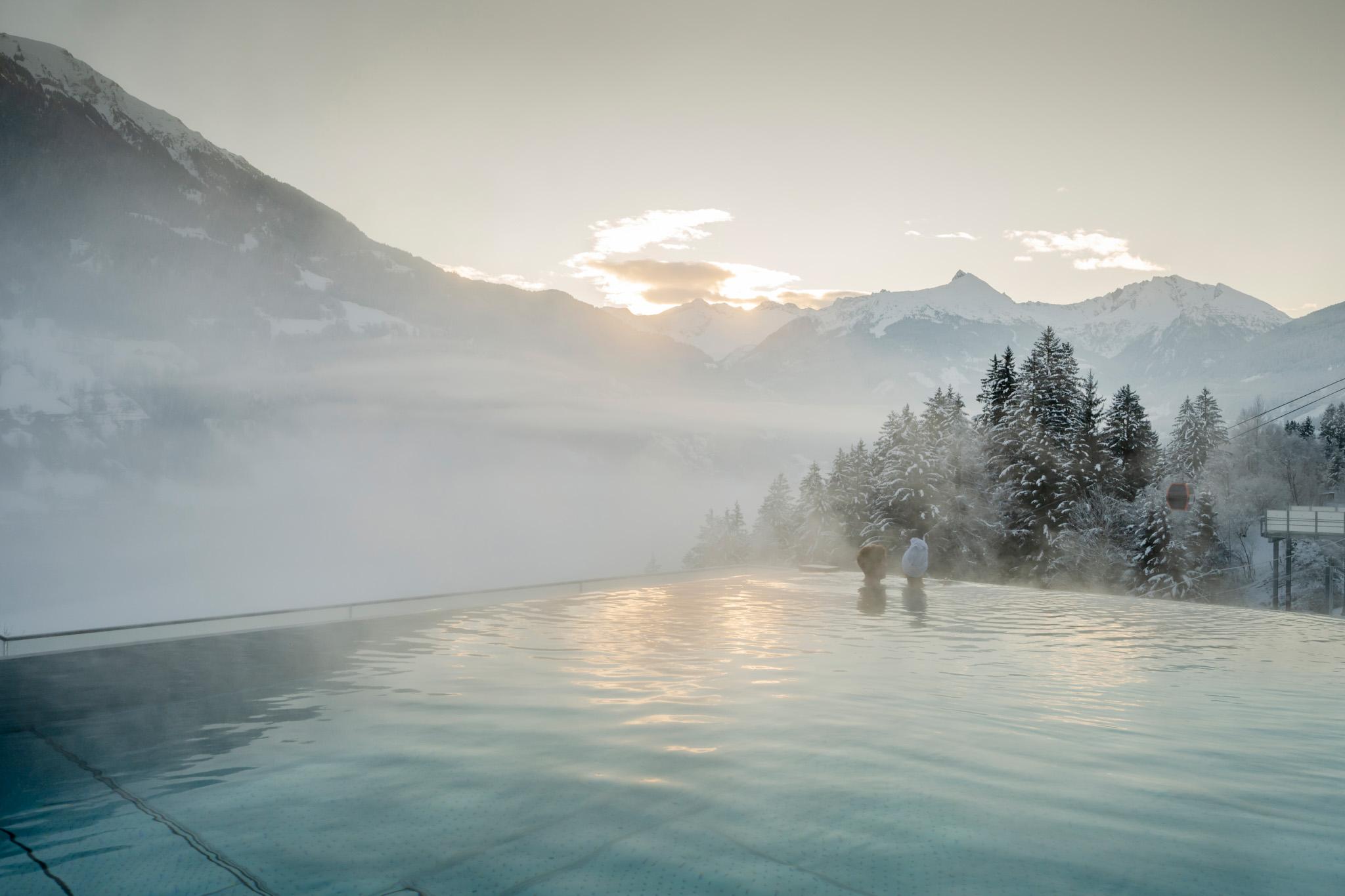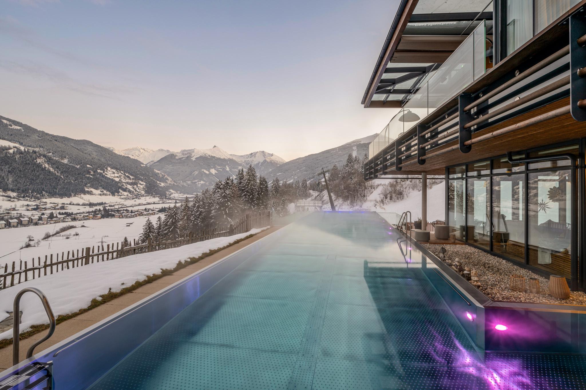 Ein Highlight zu jeder Jahreszeit ist unser freitragender Infinity-Pool (22 m), kombiniert mit Panoramasauna, Goldstollen und exklusiven Spa-Anwendungen.