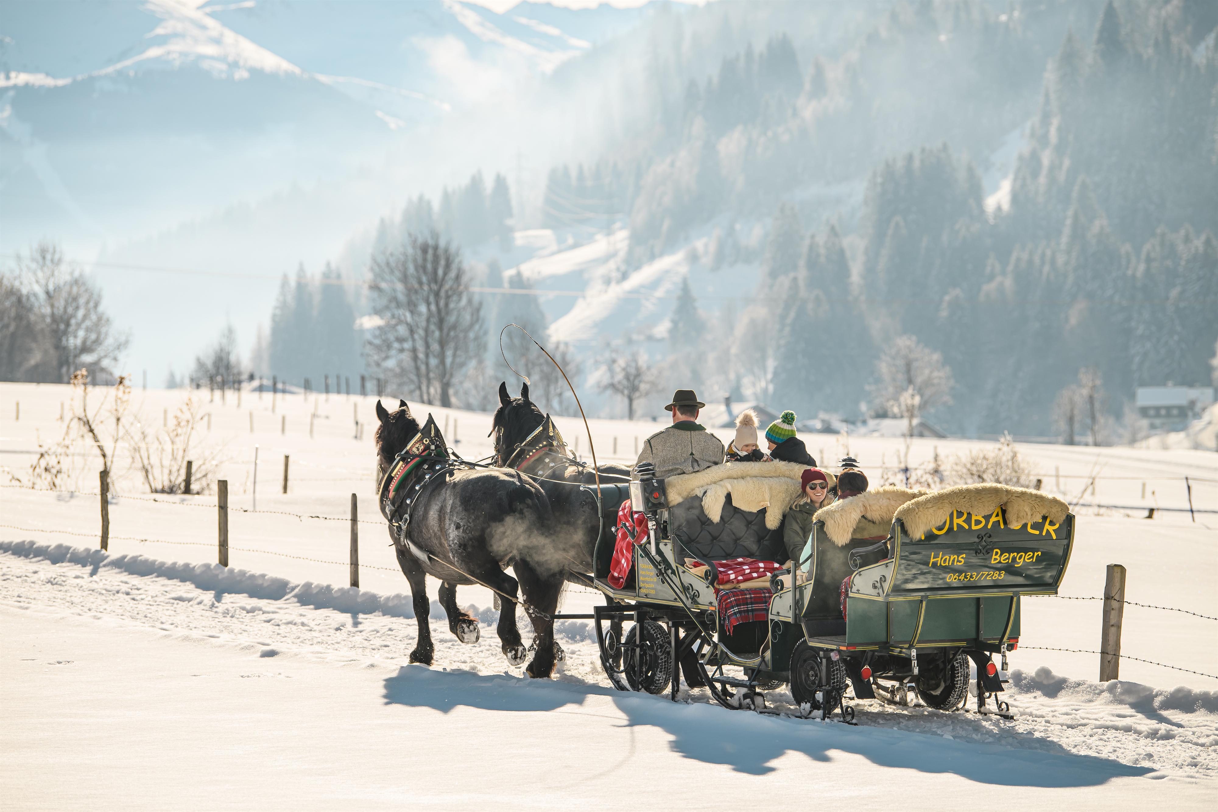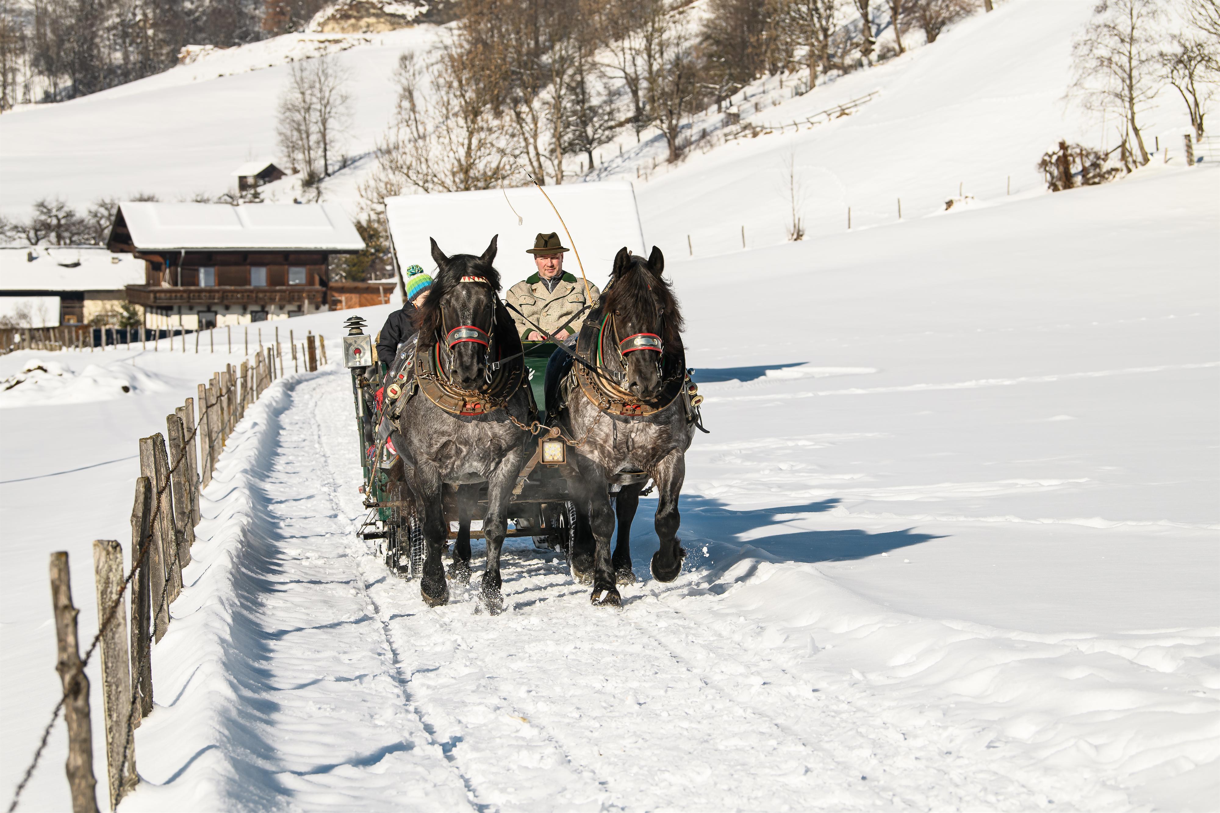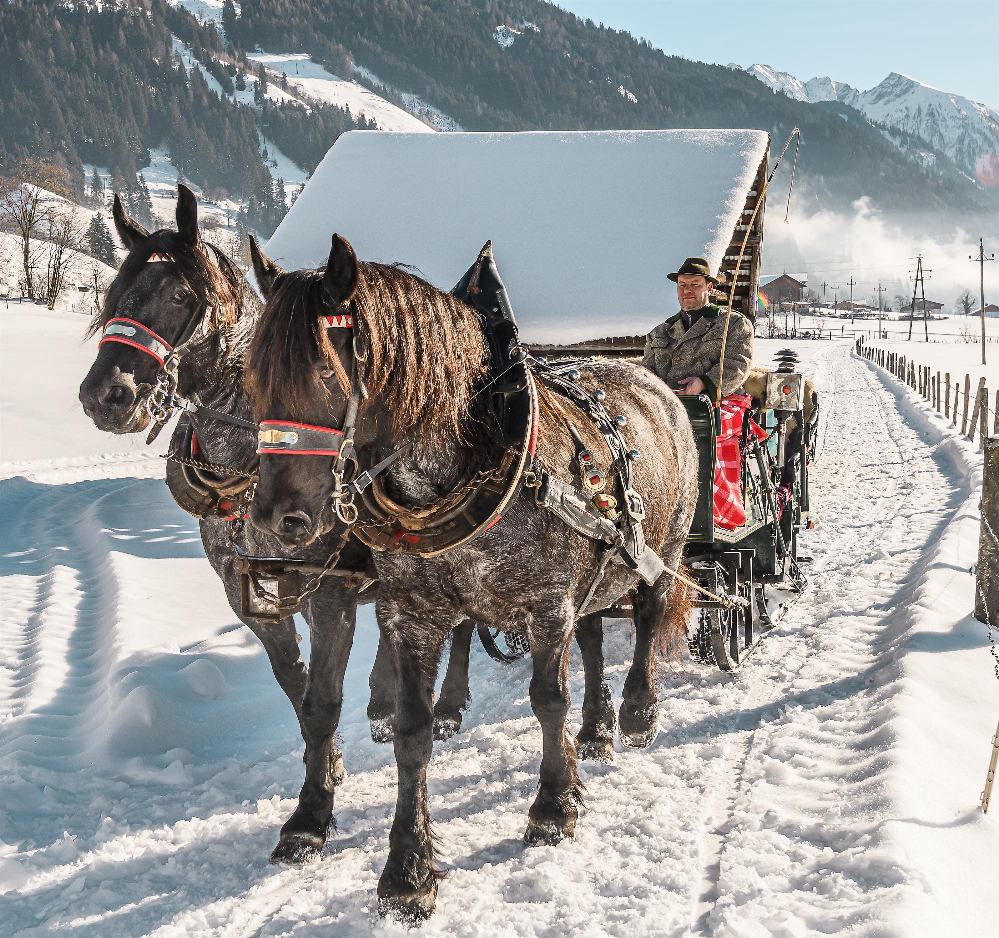 Bei einer Pferdeschlittenfahrt im beschaulichen Dorfgastein genießt man entlang verschneiter Wege und Wiesen die winterliche Naturlandschaft.