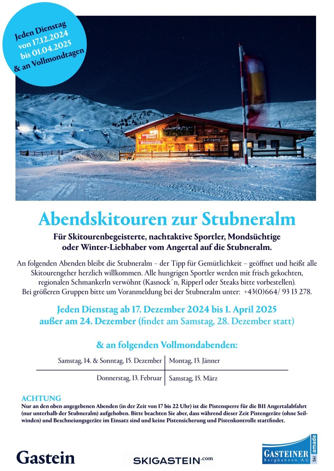 Am oben genannten Abend bleibt die Stubneralm – der Tipp für Gemütlichkeit – geöffnet und heißt alle Skitourengeher herzlich willkommen. Alle hungrigen Sportler werden mit frisch gekochten, regionalen Schmankerln verwöhnt (Kasnock´n, Ripperl oder Steaks bitte vorbestellen).