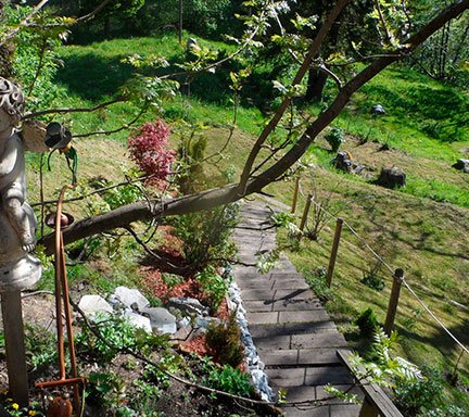 Der Wohlfühlgarten des Naturladens in Bad Gastein lädt unter schattenspendenden Bäumen zum Entspannen und Krafttanken ein.